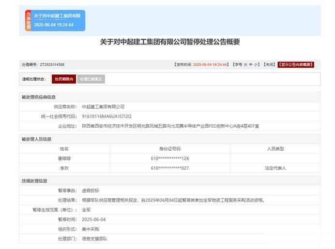 近日,军队采购网发布《关于对中起建工集团有限公司暂停处理公告概要》。公告显示,因虚假投标,根据军队供应商管理相关规定专业的股票配资官网,自2025年6月4日起暂停其参加全军物资工程服务采购活动资格。处理部门为信息支援部队。